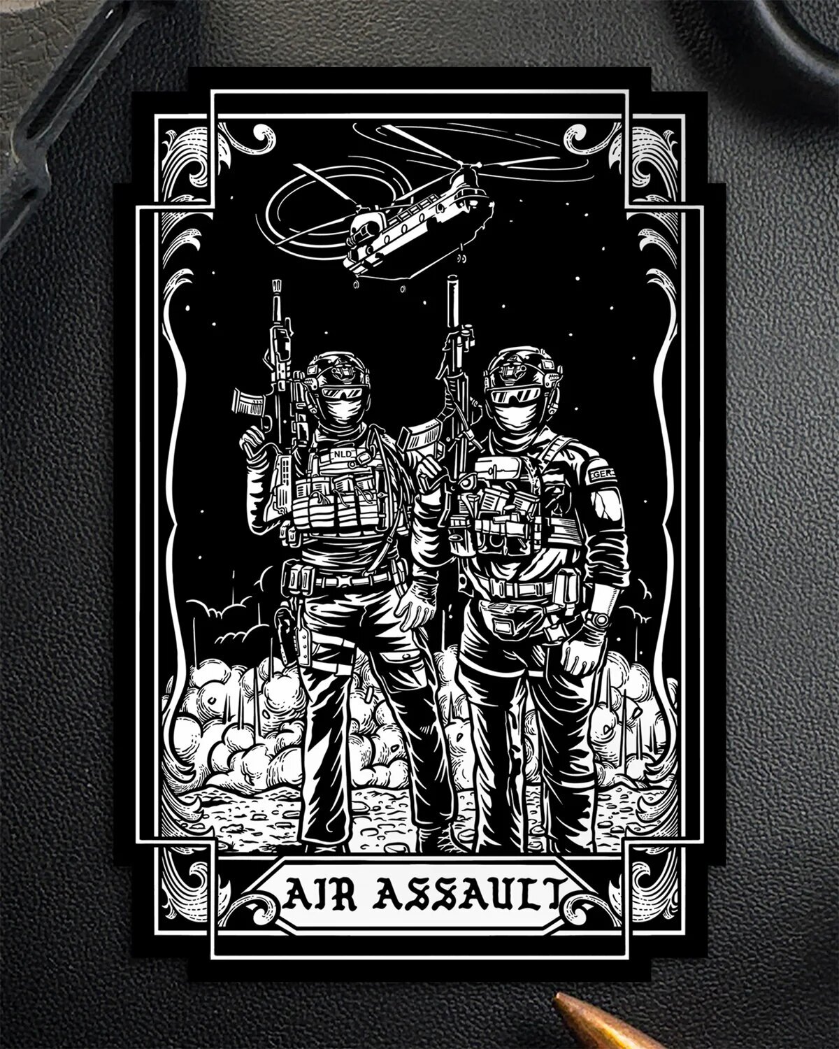 Rotor víří prach, vojáci míří vpřed. Samolepka Air Assault přenáší na malý formát intenzitu moderní bojové situace – vrtulník v nízkém přeletu, pod ním dvojice vojáků připravených zasáhnout. Výrazný motiv, který říká všechno beze slov.