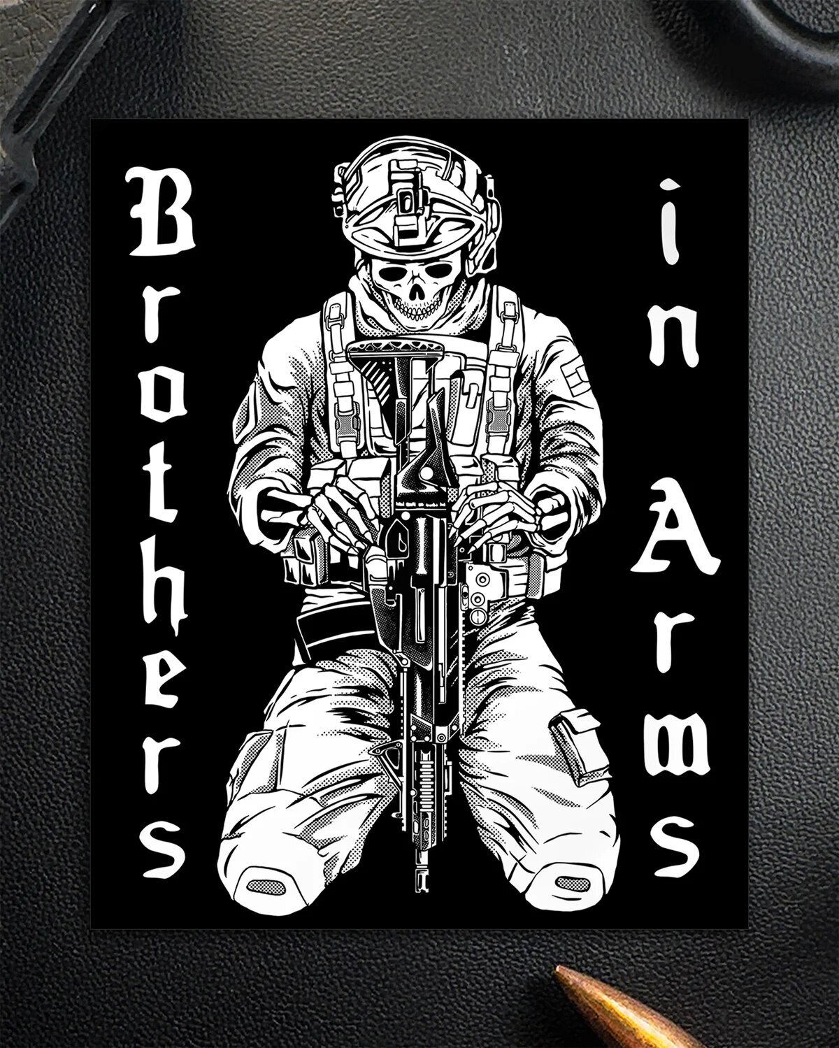 Samolepka Brothers in Arms zobrazuje celou kostru ve vojenské uniformě, orámovanou ikonickým názvem jednoty a oddanosti. Tohle není jen dekorace – je to manifest loajality, který přetrvá i za hrob.