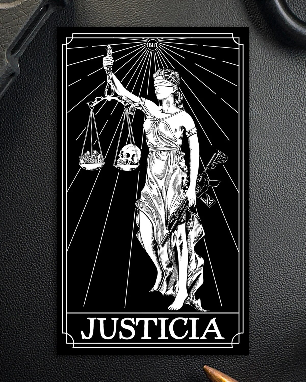 Tradiční symbolika bohyně spravedlnosti je zde reinterpretována – místo meče drží moderní pušku, což odráží realitu dnešních konfliktů, kde rozhodnutí o životě a smrti často spočívají na bedrech jednotlivců. Tato samolepka je připomínkou, že spravedlnost není jen abstraktní pojem, ale každodenní volba a čin.​