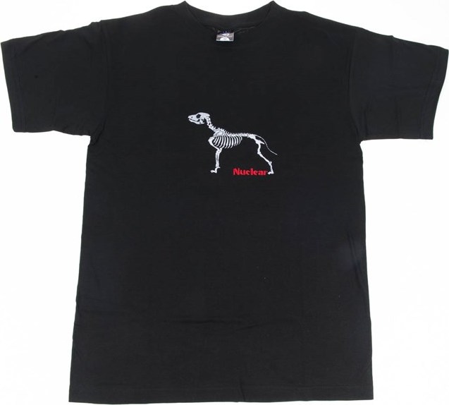 Černé bavlněné tričko s velkou bílou výšivkou na hrudi, která představuje kostru stojícího psa Pod zadní nohou kostry vyšitý červeným menším písmeme nápis "Nuclear" Kvalitní výšivka včetně všech detailů Velmi působivý vzhled Materiál: 100 % bavlna