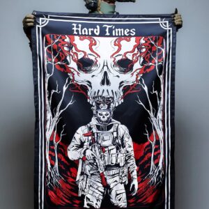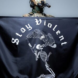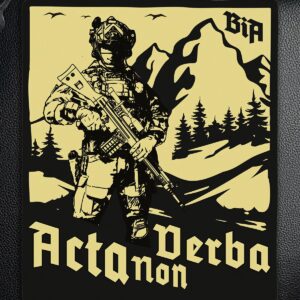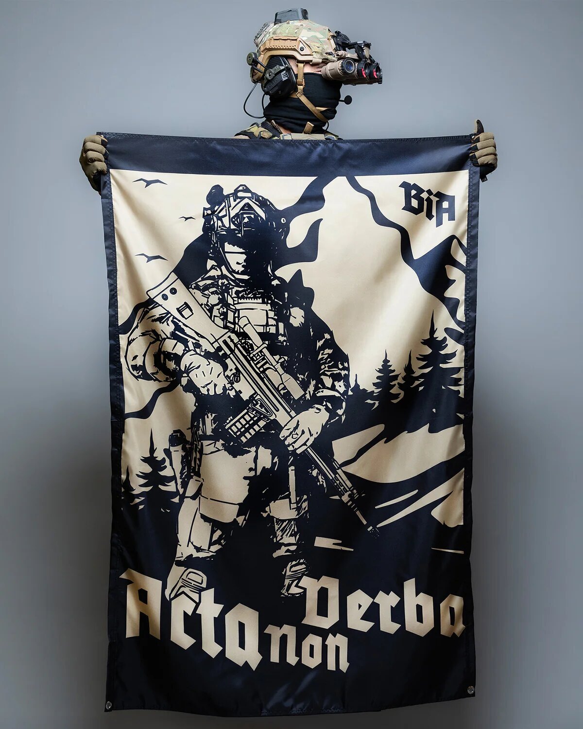 Na černém pozadí vlajky dominuje motiv Acta Non Verba spolu s logem, které podtrhuje myšlenku neústupnosti a odvahy. Tento nadčasový design vynikne v interiérech cvičeben, kasáren i domácností.