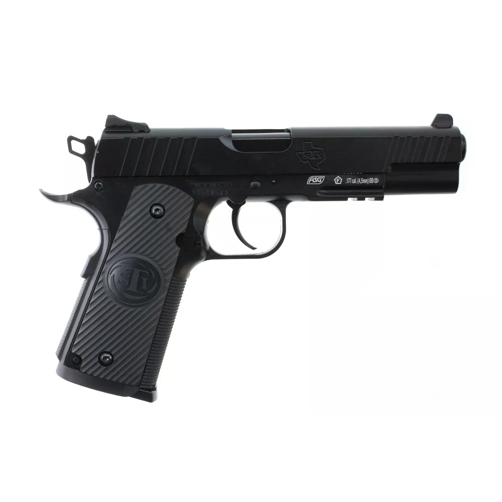 Vzduchová replika populární pistole STI Duty One se všemi detaily, včetně funkční pojistky. Na pistoli se dá přišroubovat moderátor hluku.. Vzduchová pistole ASG STI Duty One 4,5 mm je věrnou replikou originální ostré verze se všemi detaily včetně funkční pojistky. Firma ASG vyrábí tento model na základě zakoupené licence. Polymerové tělo pistole je doplněno kovovým závěrem s funkčním záchytem. K zajištění pistole slouží manuální pojistka proti nechtěnému výstřelu. Zásobník s vratnou pružinou má kapacitu 20 BB broků.